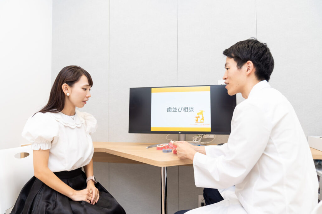 初診では、患者様の歯並びに関するお悩みをお伺いします。お口の中も拝見し、歯並びに関する問題点をチェックした上で、必要となる治療や費用、治療期間などをご説明します。マウスピース矯正の特徴や注意点などもお話します。ケースによっては、マウスピース矯正以外の方法を提案させていただくこともありますので、その点はご了承ください。