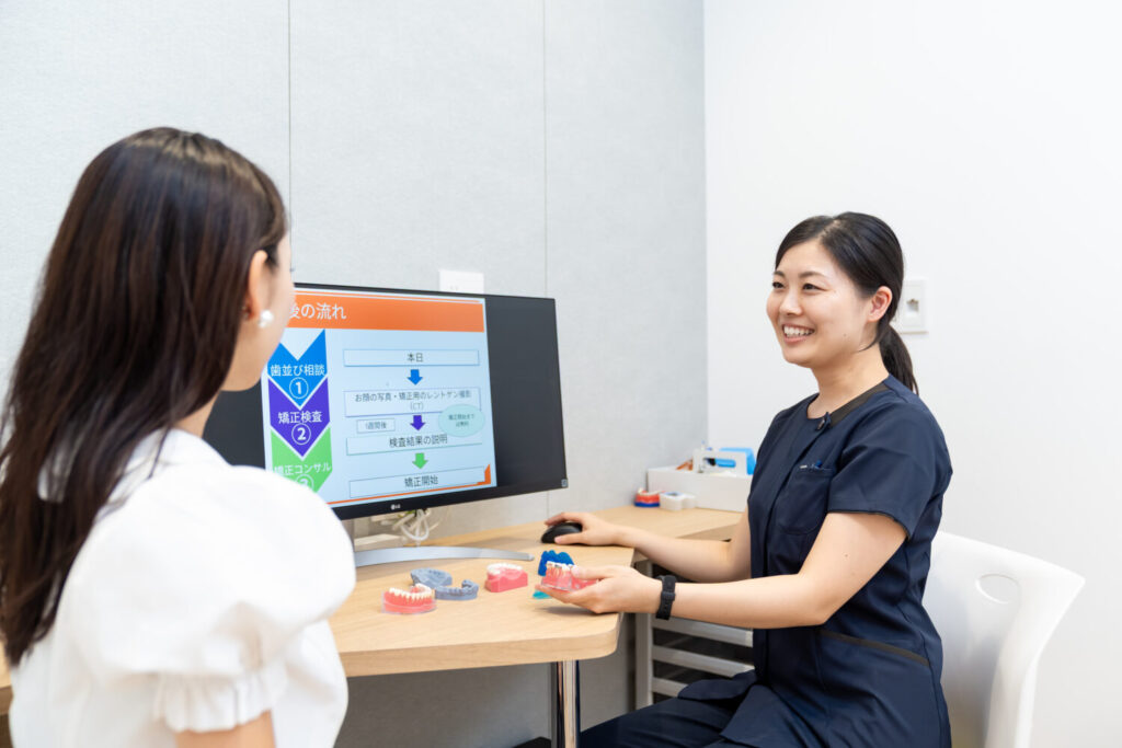 患者さまのお悩みやご希望を伺い、現在の歯並びや咬み合わせの状態を確認します。必要に応じて写真撮影や簡易的なチェックも行います。