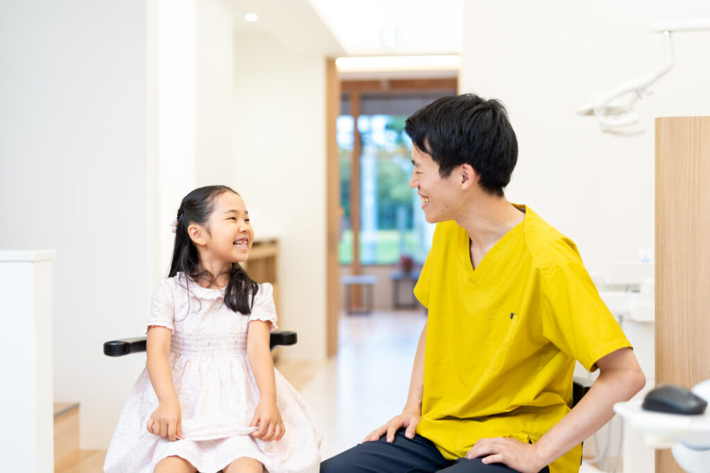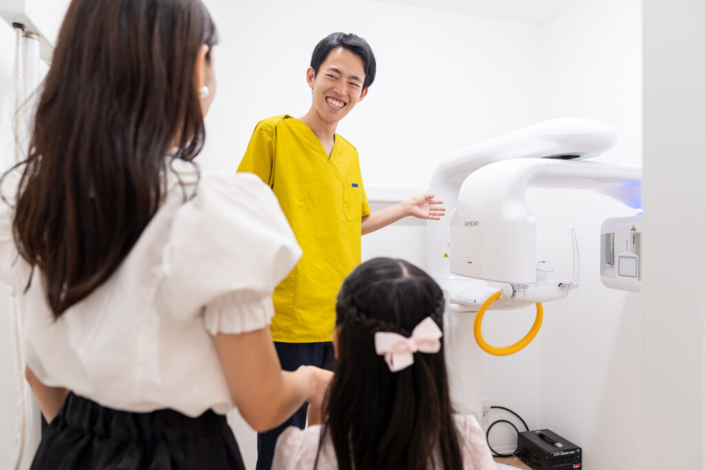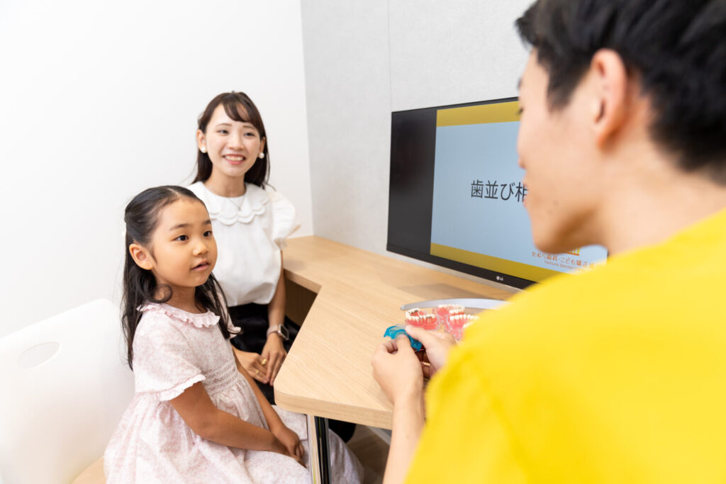 初診では、お子さまの歯並びに関するお悩みをお伺いします。お口の中も拝見し、歯並びに関する問題点をチェックした上で、必要となる治療や費用、治療期間などをご説明します。マウスピース矯正の特徴や注意点などもお話します。ケースによっては、マウスピース矯正以外の方法を提案させていただくこともありますので、その点はご了承ください。