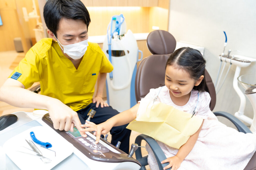 初めての治療や怖がりなお子さまには、まずチェアに座る・ライトを当てる・小さなミラーをそっと入れるなど簡単な練習から始めます。慣れたら風をかけたり器具の音を聞かせたりと段階的にレベルアップ。「できた!」の成功体験を重ね、自信がついたら本格治療へスムーズに移行します。