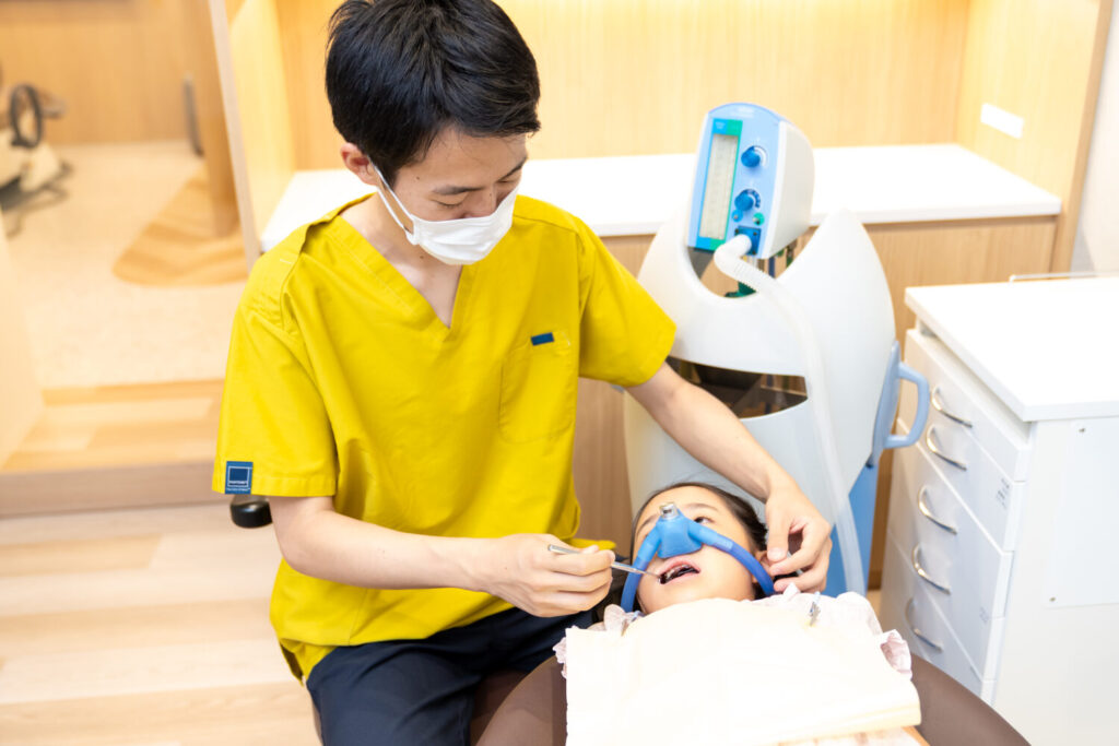 当院では、お子さまがリラックスして治療を受けられるよう、バニラやイチゴ、オレンジなど、お好きな香りを選べる笑気鎮静を導入しています。マスクで吸うだけで心地よくリラックスでき、ウトウトと眠るような感覚で、痛みや恐怖心をやわらげながら治療を進めます。治療後は数分で元どおりに覚醒。保護者同席もOK、医療現場で長年使われ安全性も確認済みなので、小さなお子さまも安心です。