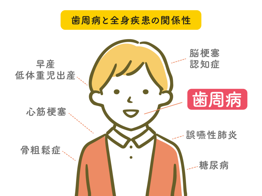 お口の中で増えた歯周病菌が血流を通じて全身に影響を及ぼし、糖尿病の悪化や心疾患、脳疾患、認知症、誤嚥性肺炎などのリスクを高めることがわかっています。さらに、妊婦の場合「早産」や「低体重児出産」のリスクが高まるという報告もあります。お口の健康は全身の健康に密接に関わっているため、歯周病予防はとても大切です。